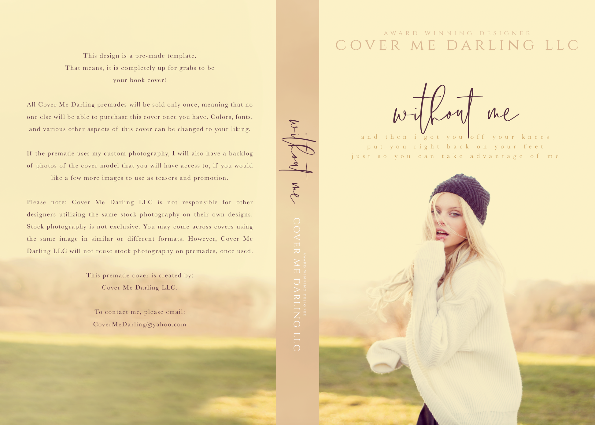 Any concept, proof, final file, or artwork, MAY NOT be altered by anyone except Marisa Black of Cover Me Darling, in whole or in part. The client also understands that additional charges may apply for any alterations after approval and/or after final files are sent. Changes after the final files are sent will begin at $50, and may increase with the amount of files that need to be altered.